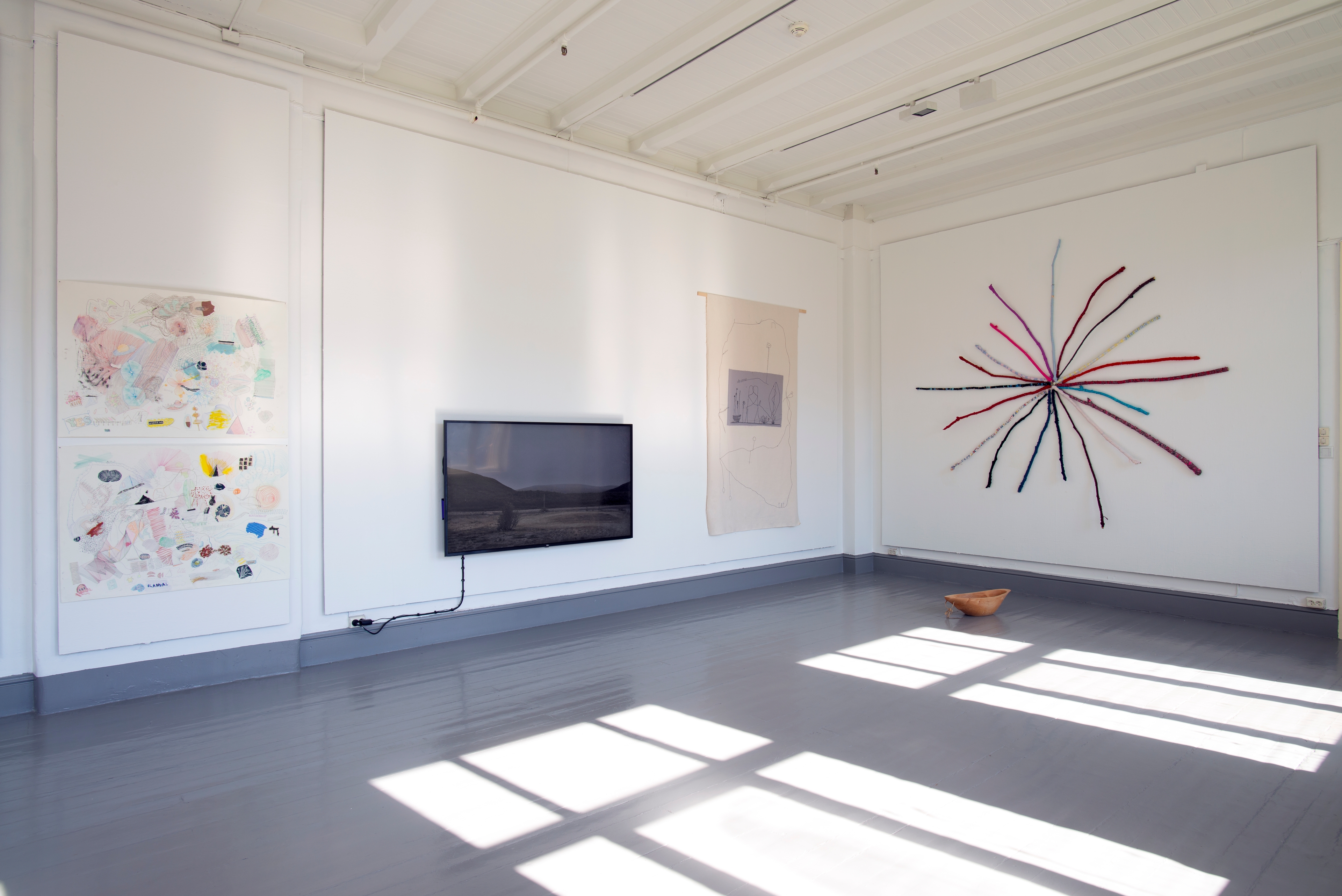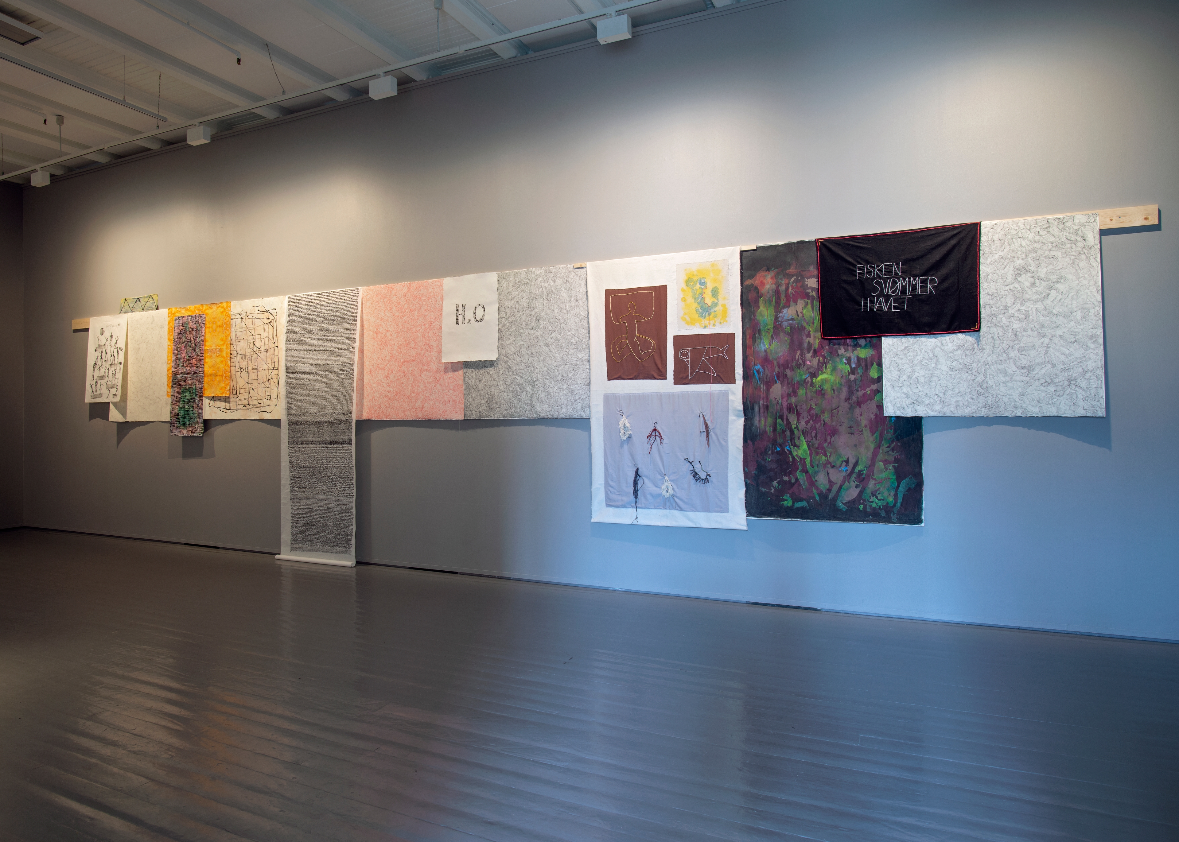 The exhibition at Tromsø Kunstforening has a sideways glance at life in the sea. Fish appear in shoals and the sea is a surrounding environment on paper and textile. The variegated exhibition form, with many parallel expressions and media that never seek rigour, escapes taming: it is itself to be regarded as a wild otter. Tårnesvik's motifs revolve around all kinds of animals; seals, giraffes and swans may be freely sketched with a light outline, but at the same time they are written into a politically pointed message. The ecosystem has been messed up by our actions, while at the same time embracing a greater resistance to oppressive strategies. There are parts of nature that should never be tamed and moulded, but we continue tirelessly against our better judgement. The wild is hopeless.